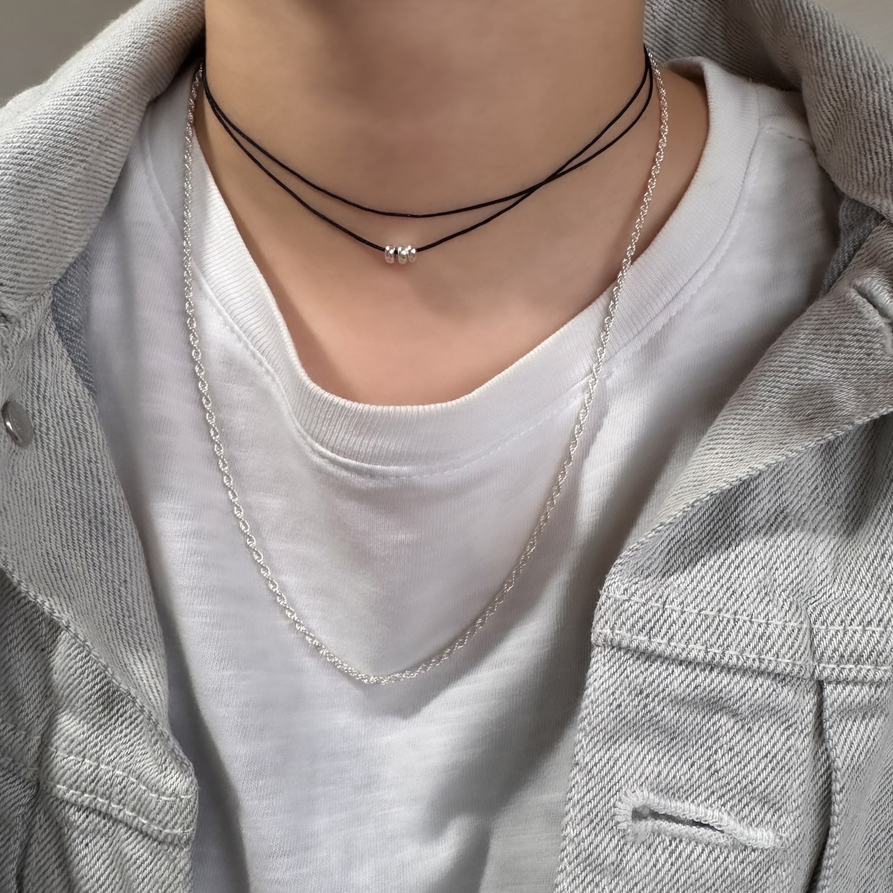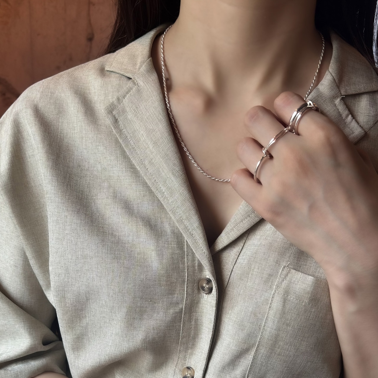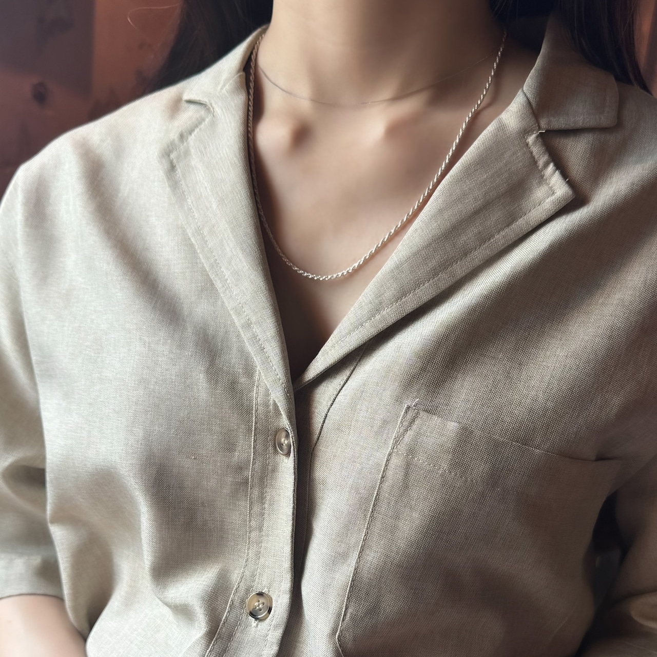 シンプルにTシャツに合わせても、デコルテの見えるお洋服にもしっくりサマになるアイテムです