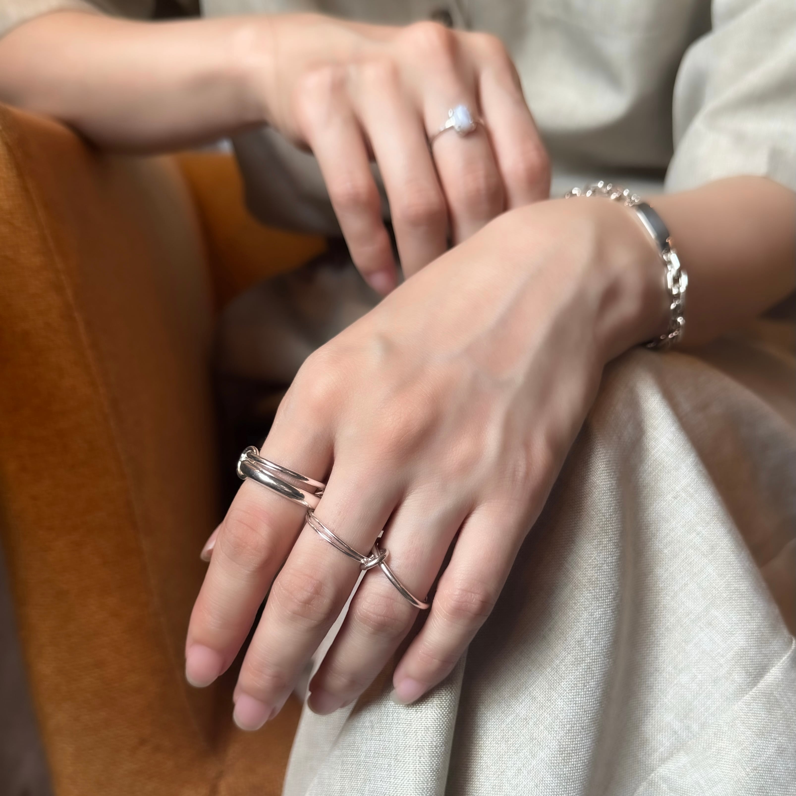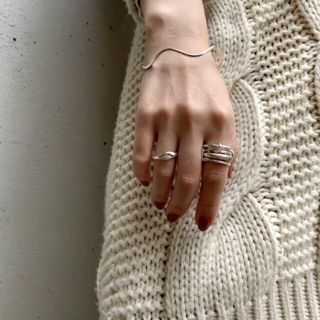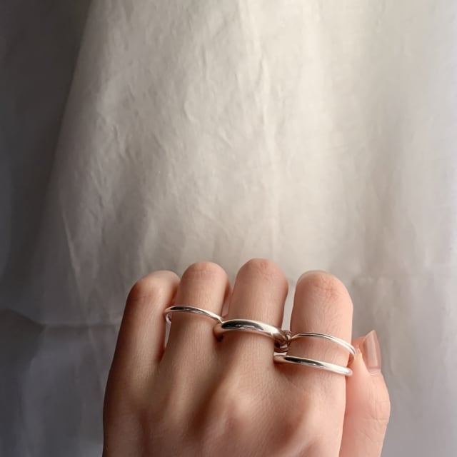 4つのパーツに分かれているリングを1本の指に重ねてみたり、2本、3本の指に分けてつけたりとその時の気分によってつけられます。