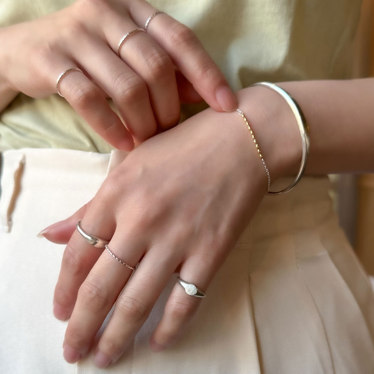 シンプルなリングとはもちろんのこと、個性的なリングとの相性も良いのでコーデに必ず取り入れたくなる、そんなリングです
